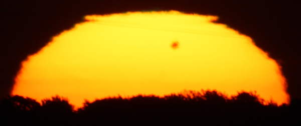 5:13 MESZ: Erstes Bild mit Baader-Sonnenfolie ND5 bei ISO 400, 1/8 s; Sonnenflecken sind jetzt besser zu sehen.