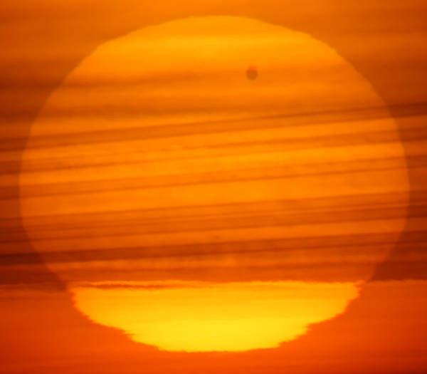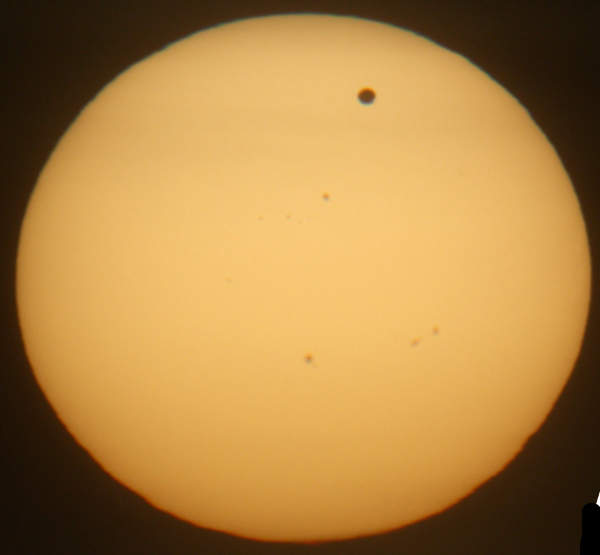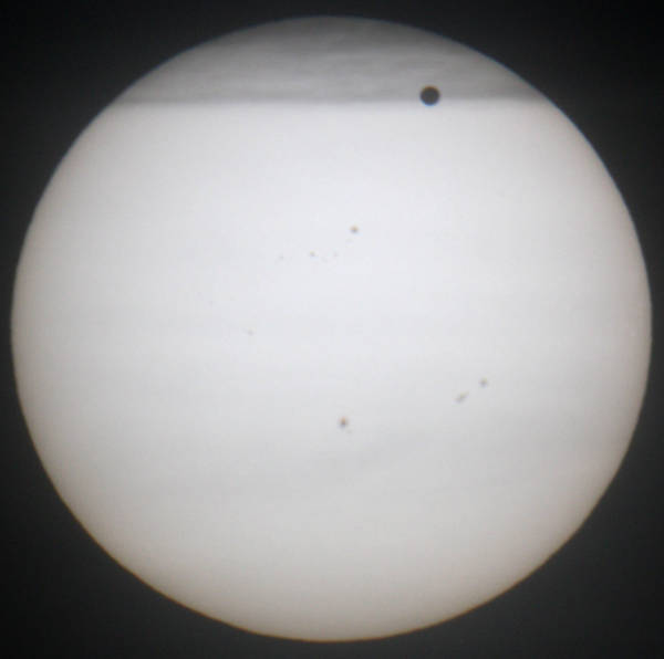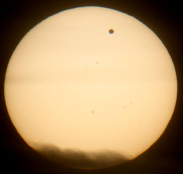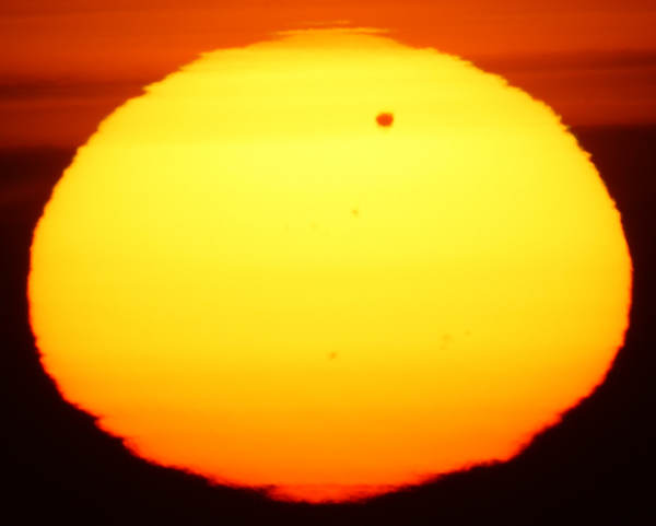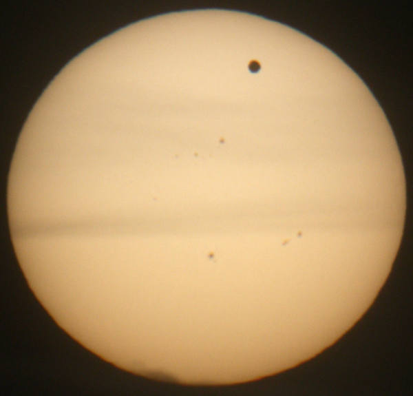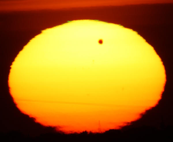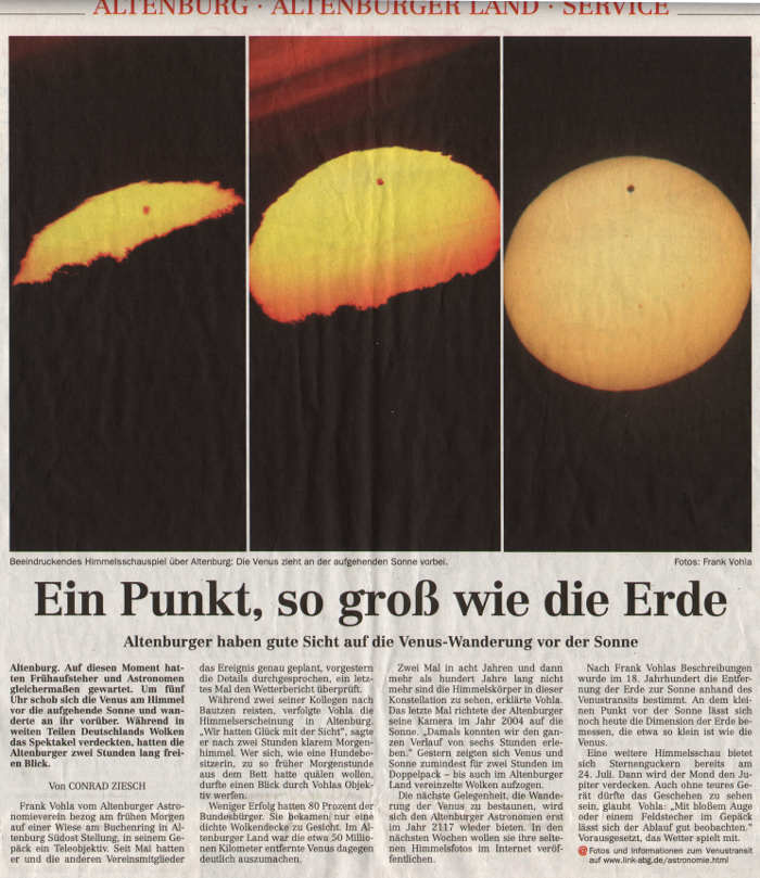 In Altenburg beobachteten Horst Horn, Georg Junge, Frank Vohla (Fotografierender) und zwei Frauen, die als Gäste an der Boebachtung teilnahmen am Feldrand östlich von Südost. Dieser Beobachtungsplatz mit freiem Nordosthorizont hatte sich schon 2004 bewährt und auch bei zahlreichen Finsternissen, Astronomietagen und anderen Ereignissen.4:58 MESZ: Der Sonnenaufgang hat begonnen und schon ist die Venus nahe am oberen Sonnenrand zu sehen. Belichtungszeit: 1/200 s bei ISO 200.