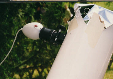 Webcam zerlegtDie Schraube rechts hat ein Gewinde M 12x0,5 und ist mit einer 8-mm-Längsbohrung  versehen. Die Messinghülse links daneben hat einen Außendurchmesser von 31,8 mm. Links neben der Kamera befindet sich das herausgeschraubte Originalobjektiv. Beobachtet wird im Primärfokus.