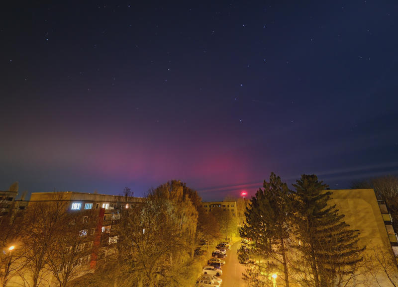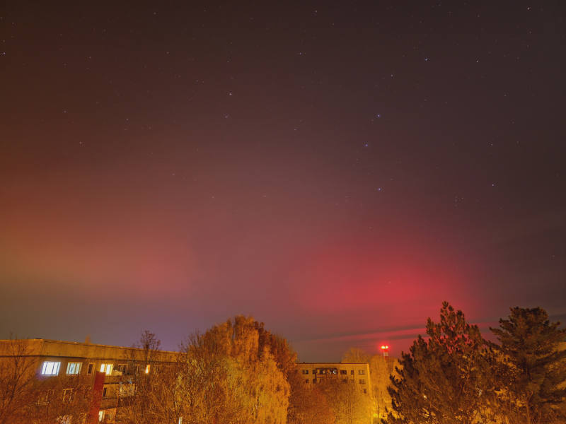 Bei 200 mm Brennweite ist der Komet besser erkennbar und das Rot des Polarlichts ist noch da. Komet und Polarlicht in einem Bild dürfte ein Novum für das Altenburger Land sein.