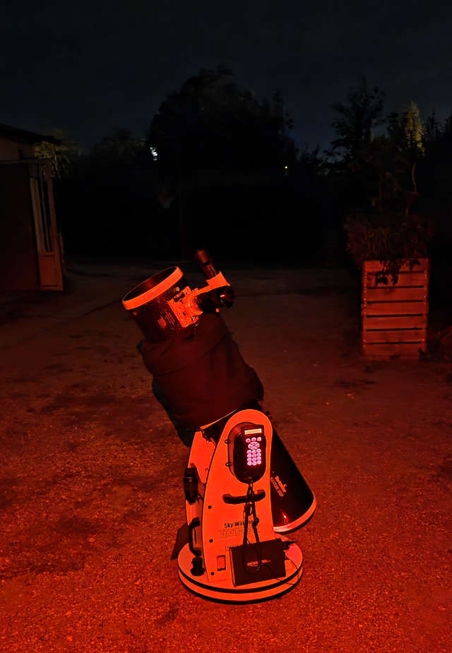 speziell für Sonnenbeobachtungen konstruiert. Das Fernrohr hat einen fest eingebauten Sonnenfilter und die Montierung sucht die