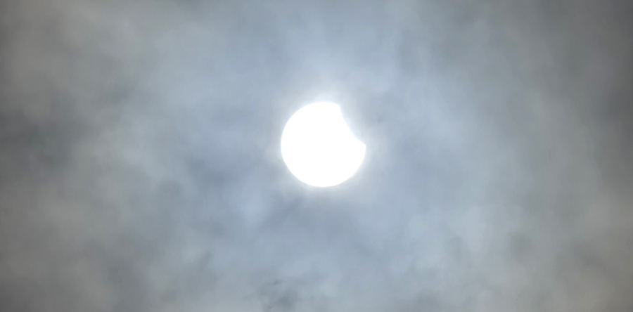 Die Hoffnung war nicht unberechtigt. Für das bloßem Auge zeigte sich die angeknabberte Sonne 11:52. Handyschnappschüsse waren auch möglich. Zur Ausrichtung des Fernrohrs reichte das nicht. Diese Aufnahme von Frank Vohla mit einem Samsung S25 Ultra ist noch überbelichtet.