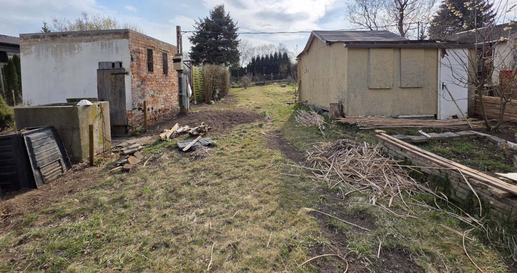 Im März 2023 wurde die ca. 250 Quadratmeter große Nachbarparzelle frei und übernommen. Die Grenze lag zuvor an der Rückseite des Steinbaus links, der zur Sternwarte umgebaut wird. Die Laube rechts und die Wiese dahinter gehören zur Erweiterung.